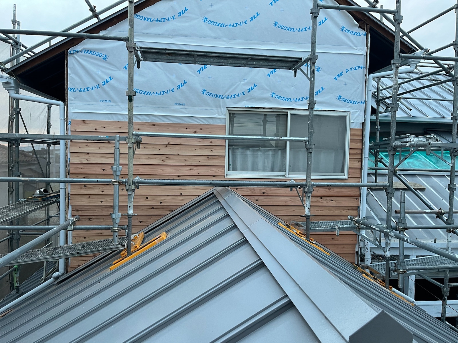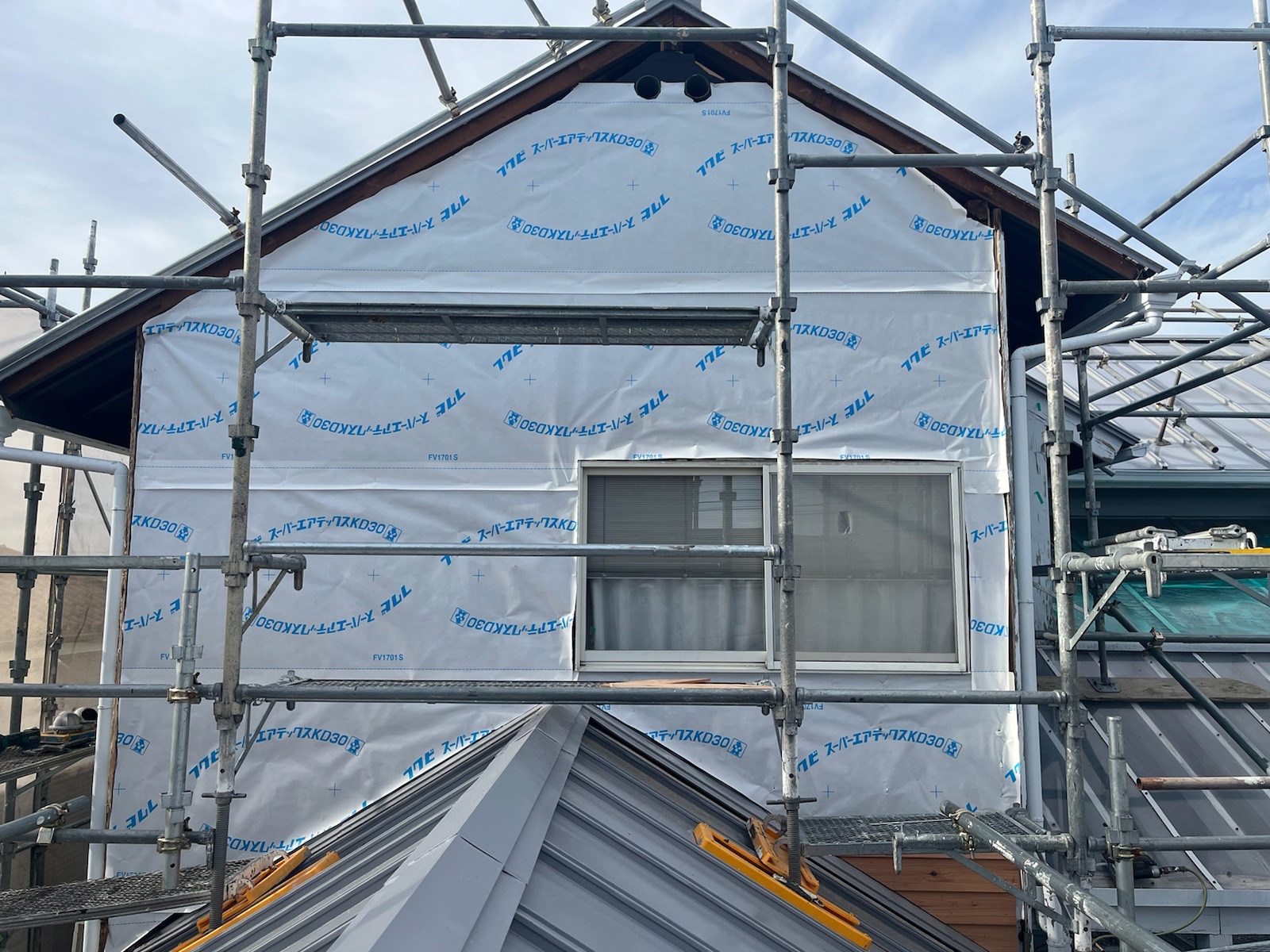 傷んだ外壁材を撤去したら、透湿防水シート(水を通さず湿気を通すシート)を貼ります。このあと、材木を下から上に1枚1枚張りあわせていきます。