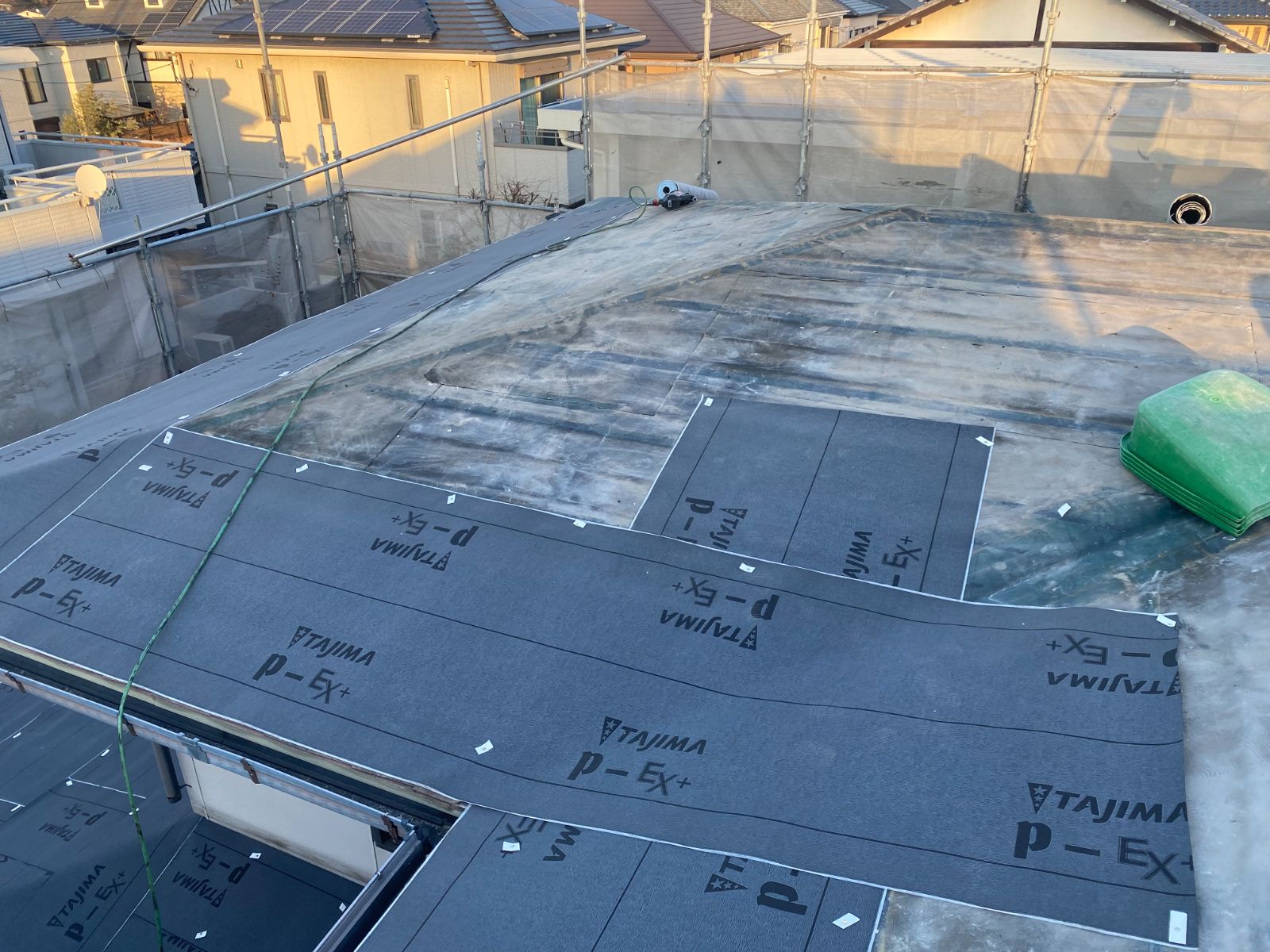 屋根と野地板の間には、ルーフィングシートと呼ばれる防水シートが存在します。万が一、雨水が侵入しても建物内部まで侵入する事を防止する為、ルーフィングシートを再度施工していきます。