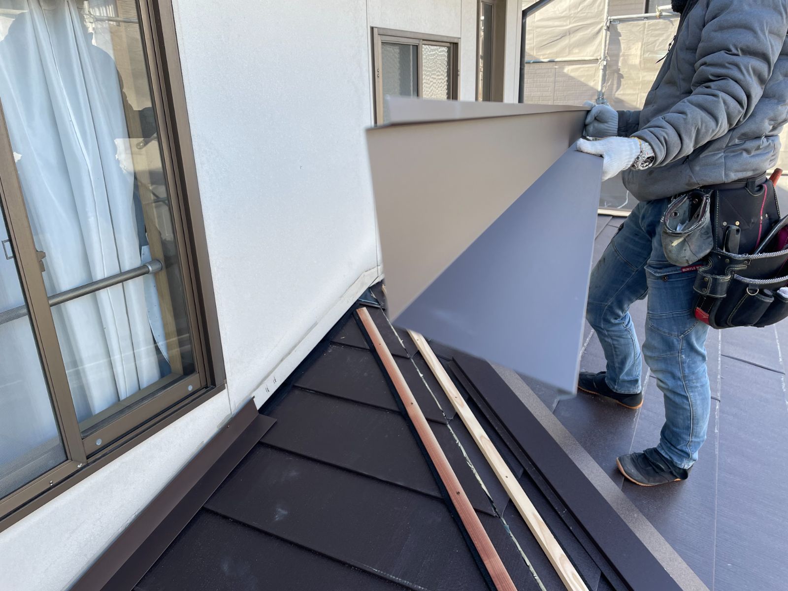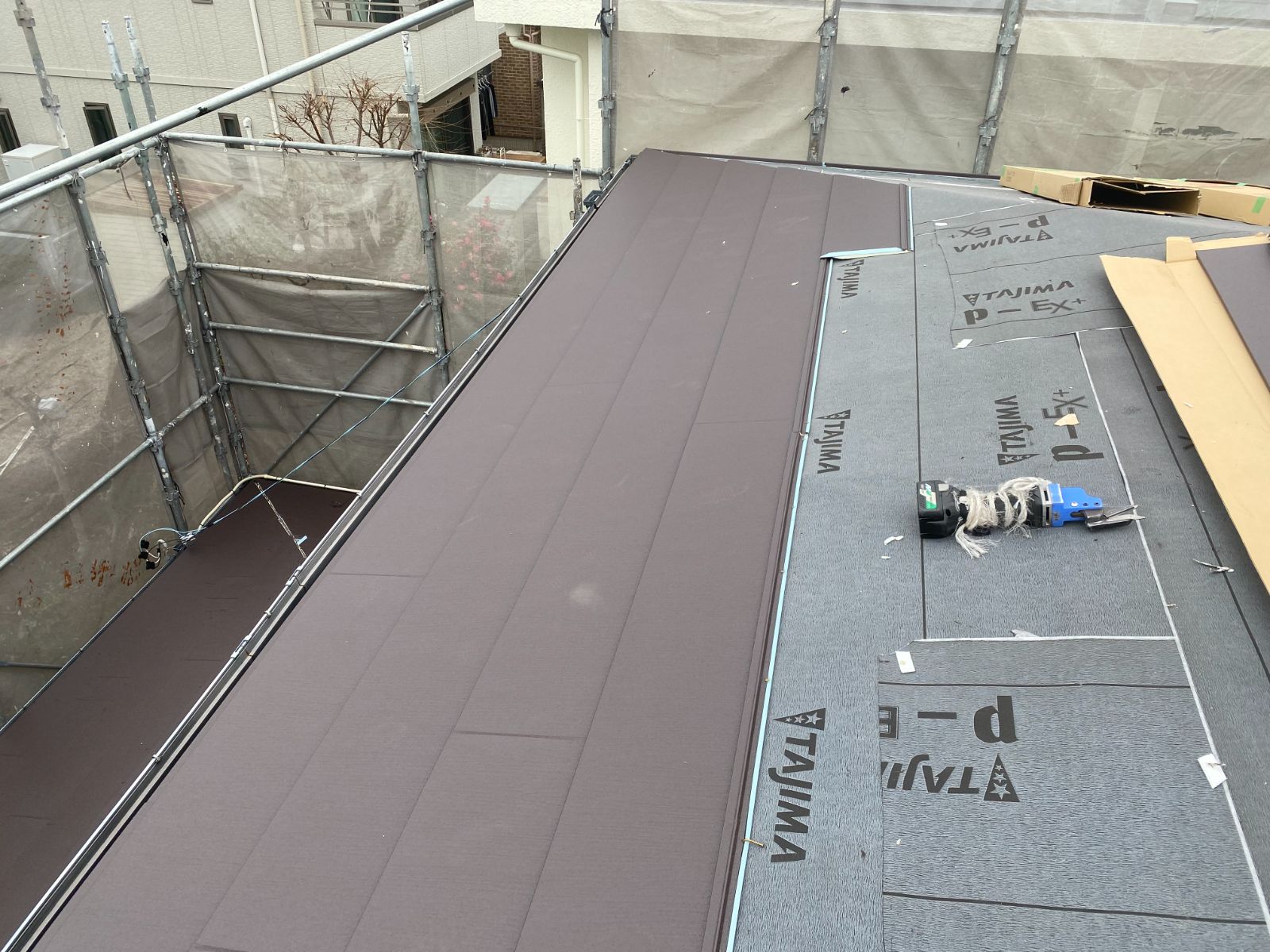新しい屋根を葺きます。今回は、金属系屋根材であるスーパーガルテクトを使用。