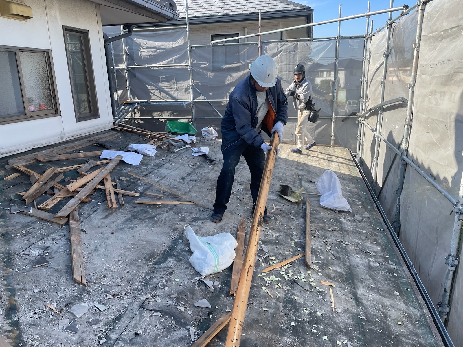 また、『セキスイかわらU』の上に乗って歩くと、場所によってはバリバリと簡単に割れてしまいます。破片が残らないように、撤去後には清掃作業をしてから次の作業を進めていきます!