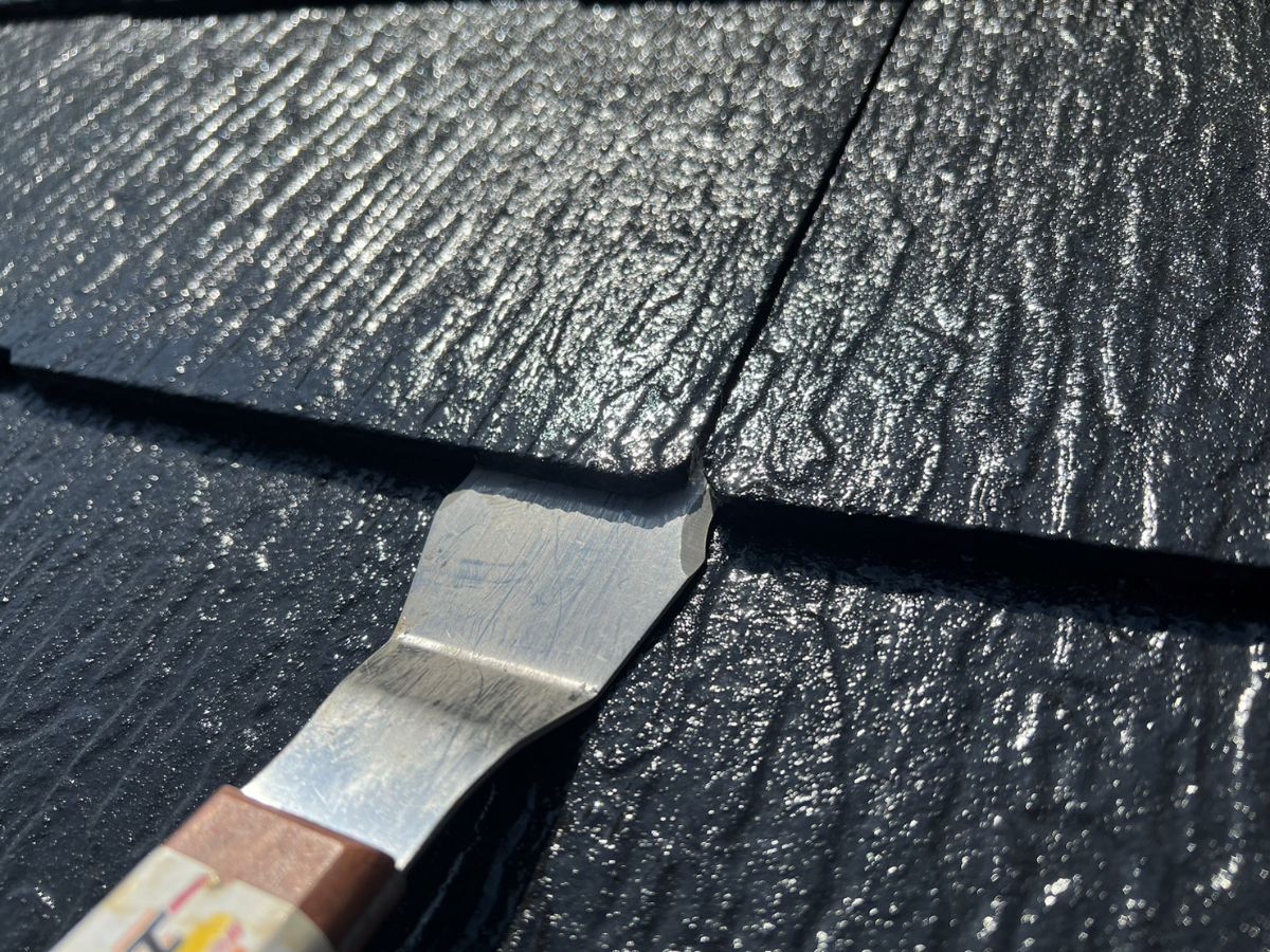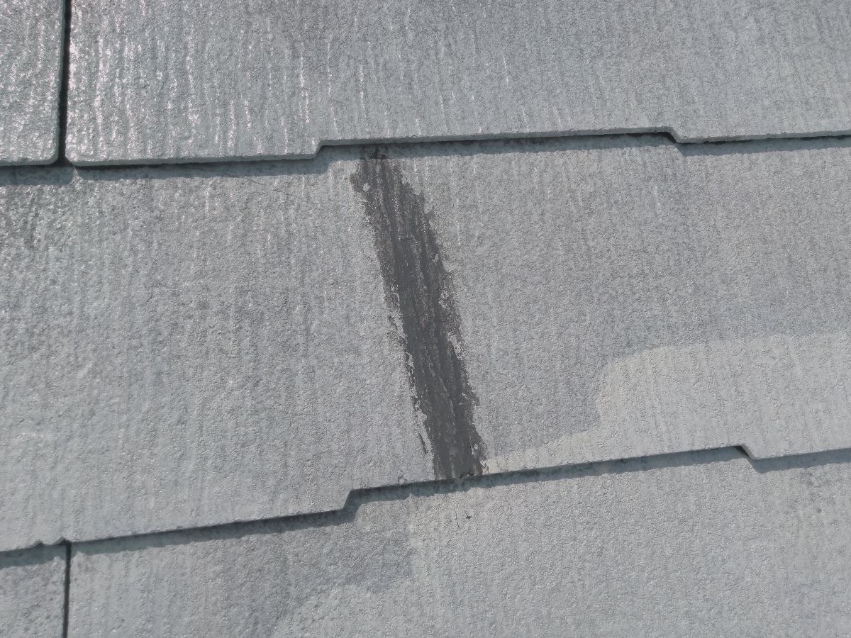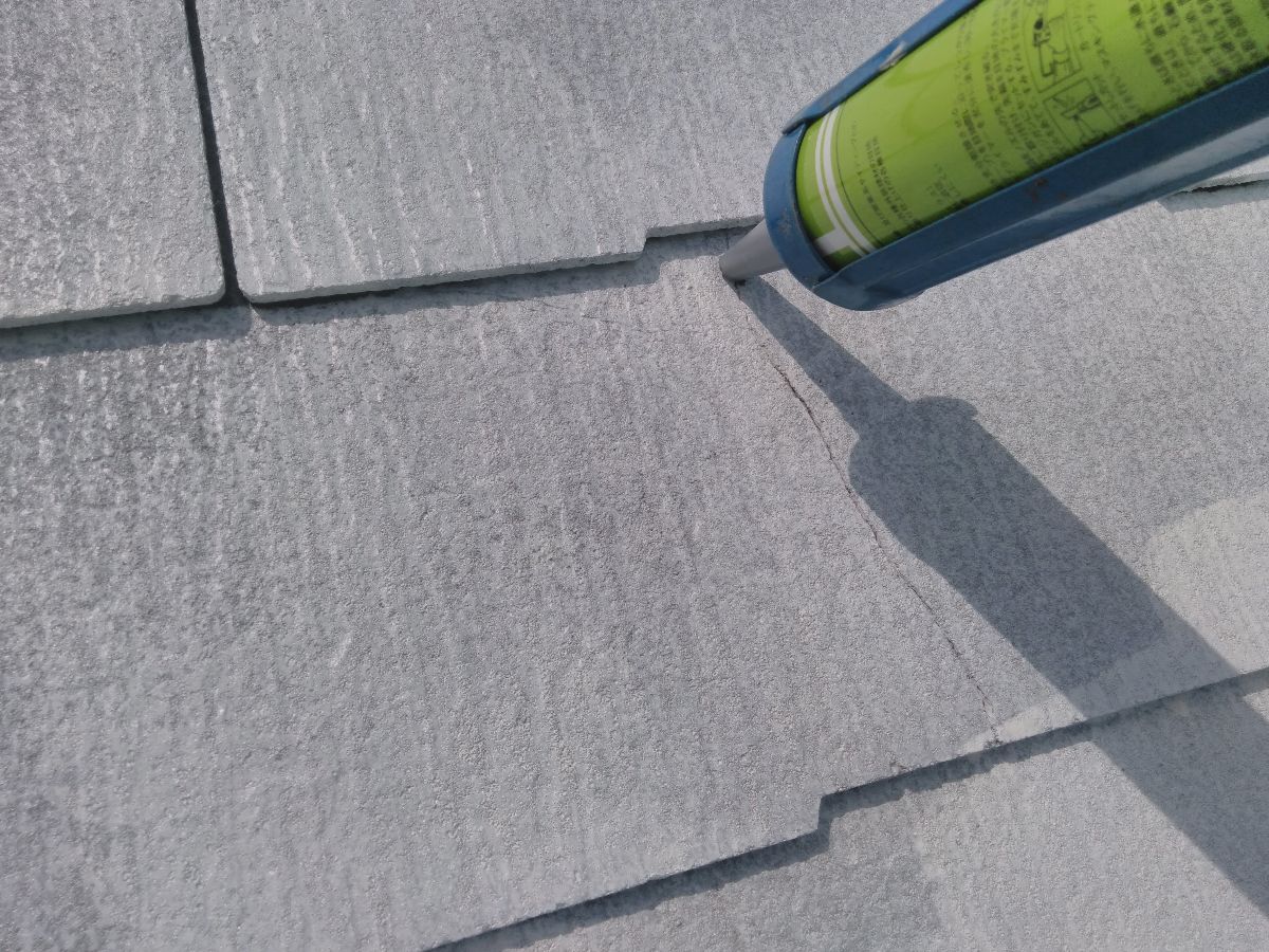 屋根のひび割れ箇所はコーキング(シーリング)で補修することが多いです。さまざまな工事にコーキングが使用されますが コーキングにも種類があり、使用する場所や用途によって適したコーキングで補修しています。スレート屋根の補修には、コーキングの上に塗装できるモノを使用しています。