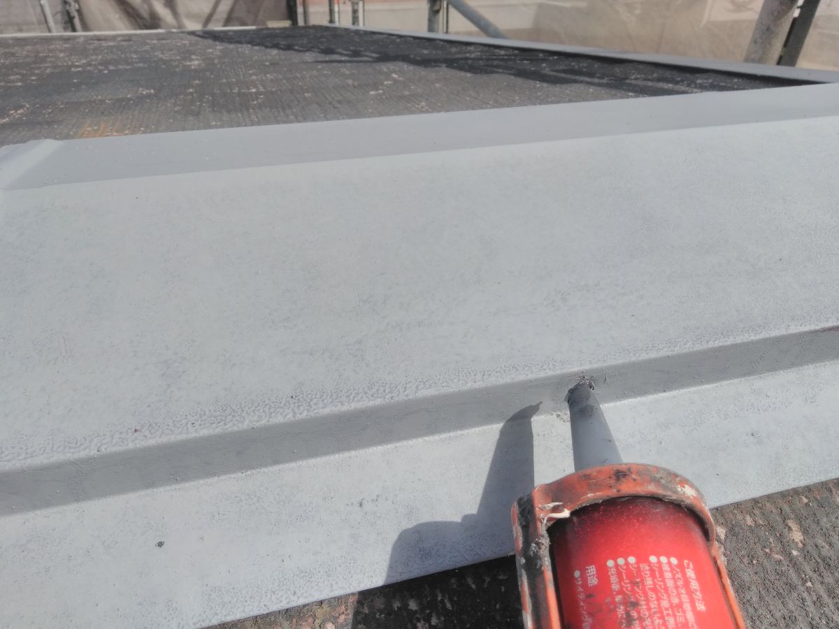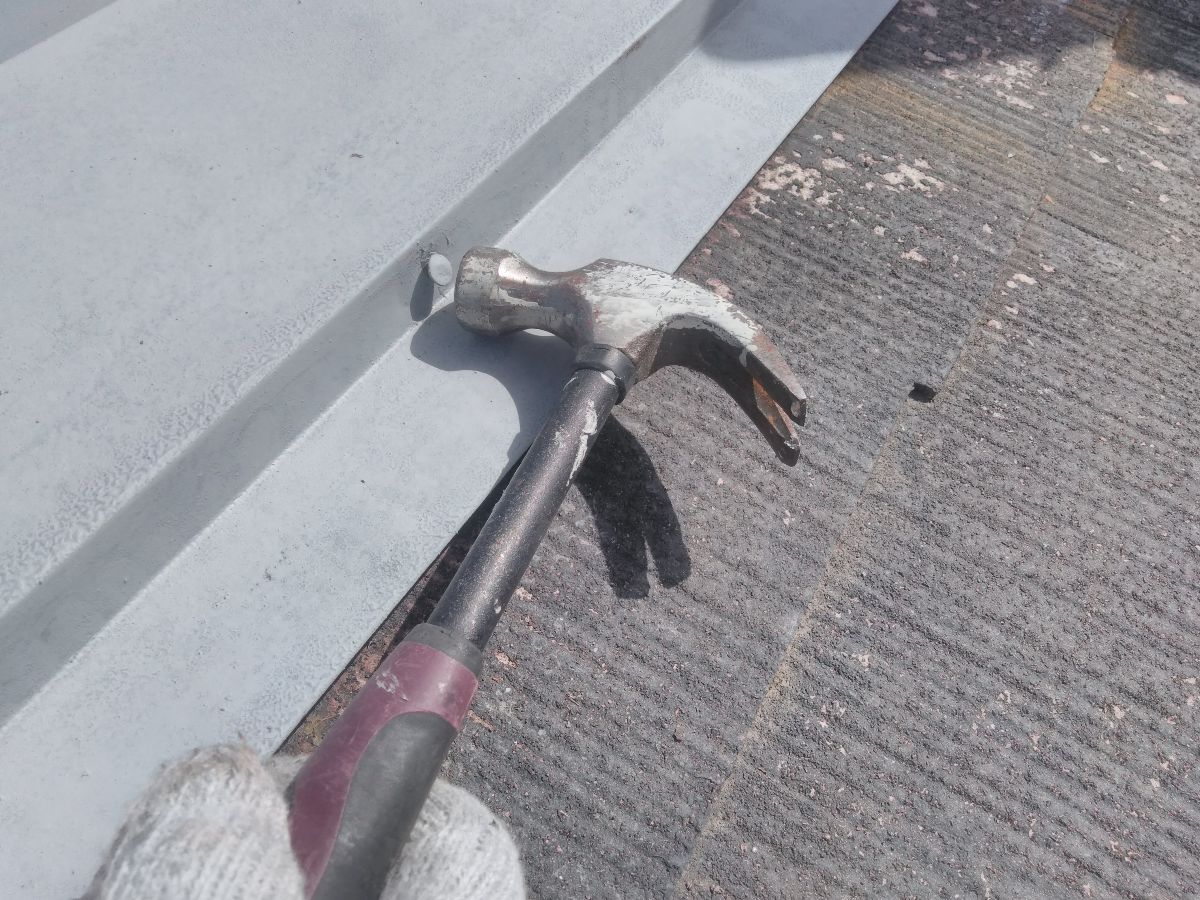 屋根板金の釘は、経年劣化により釘が徐々に浮いてきます。そちらを打ち直し、釘を定位置に戻し、シーリング材によって抜けてくることを防ぐ処理をしていきます。