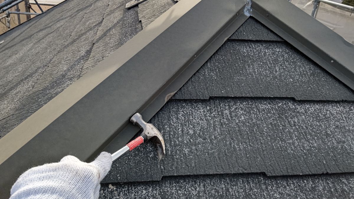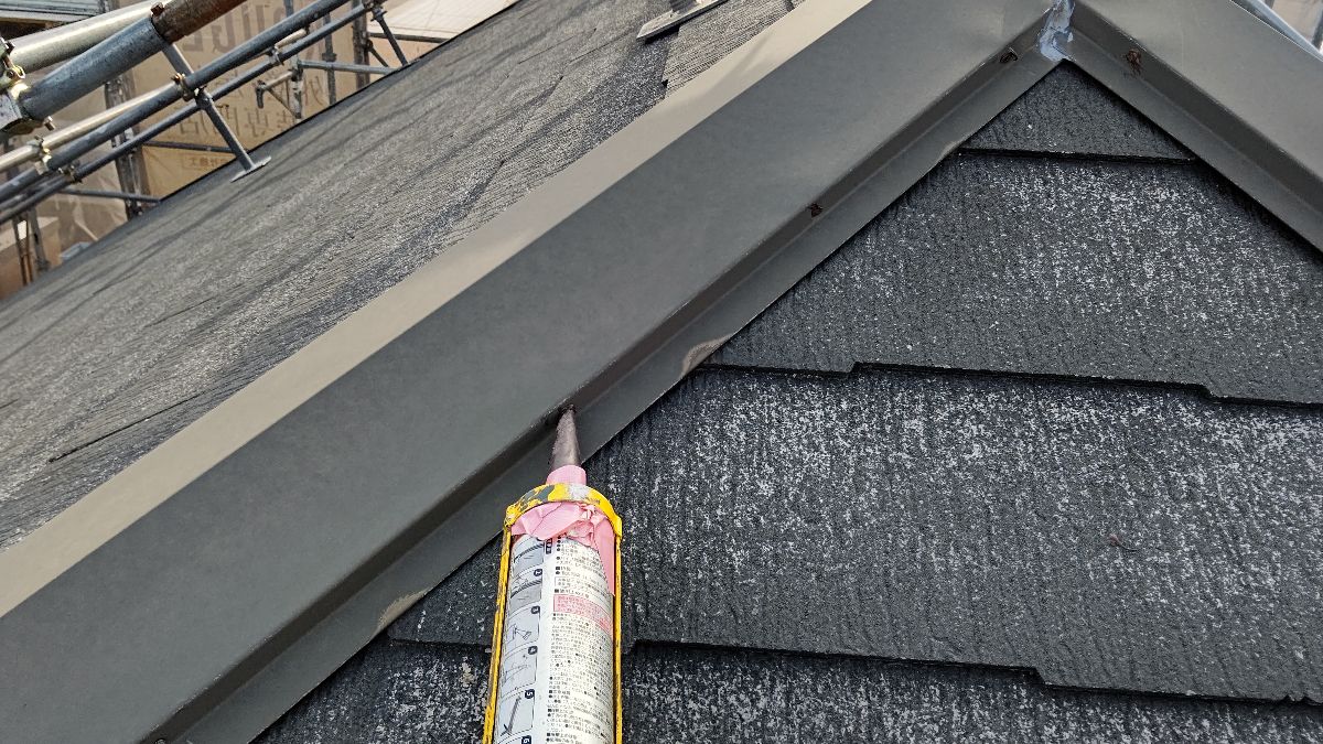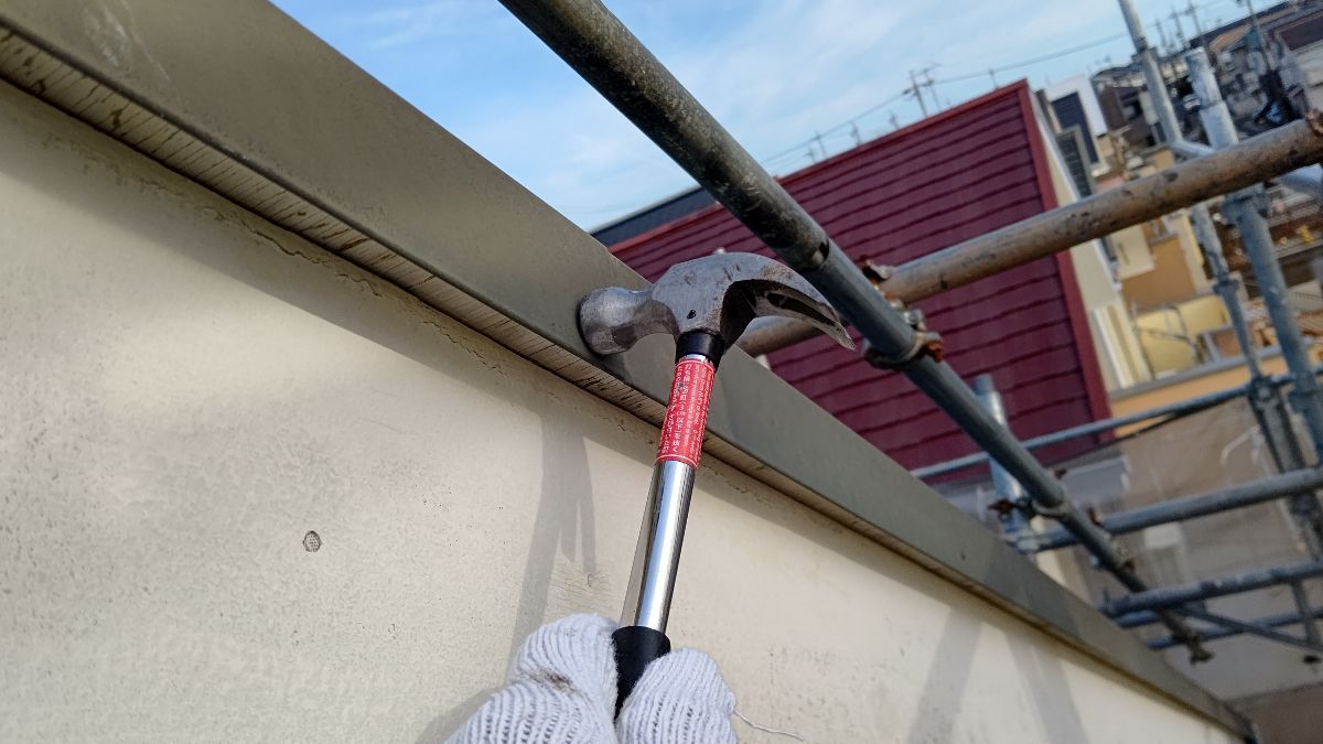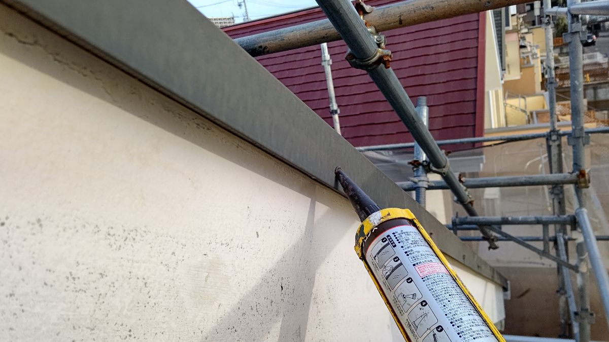 板金部分の釘が経年劣化で抜けてくることがありますので、打ち込み直してコーキングにて抜け出ないよう止めていきます。