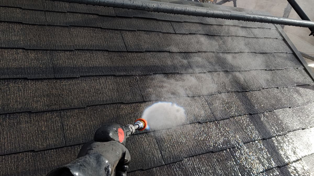 下塗り後にタスペーサーを設置して、屋根の通気を確保します。屋根材の間を塗料でふさいでしまうと、雨水の排出が妨げられて、屋根下地の腐朽や雨漏りの原因になってしまう事があるためです。