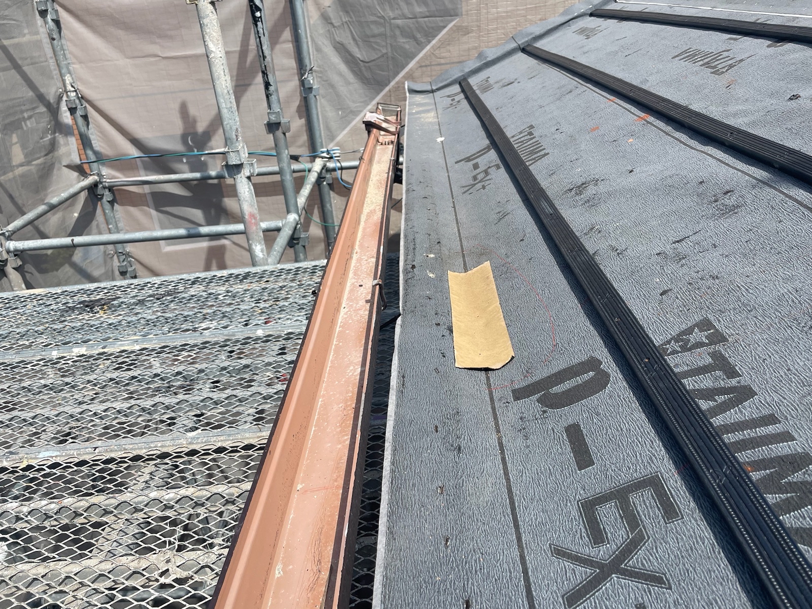 東海工芸の場合は、一般的なアスファルトルーフィングではなく、より耐候性が長くなるように改良された「改質アスファルトルーフィング」と呼ばれるルーフィングシートを使用しております。長い間、安全にお住まいいただけるように心がけて施工しております。