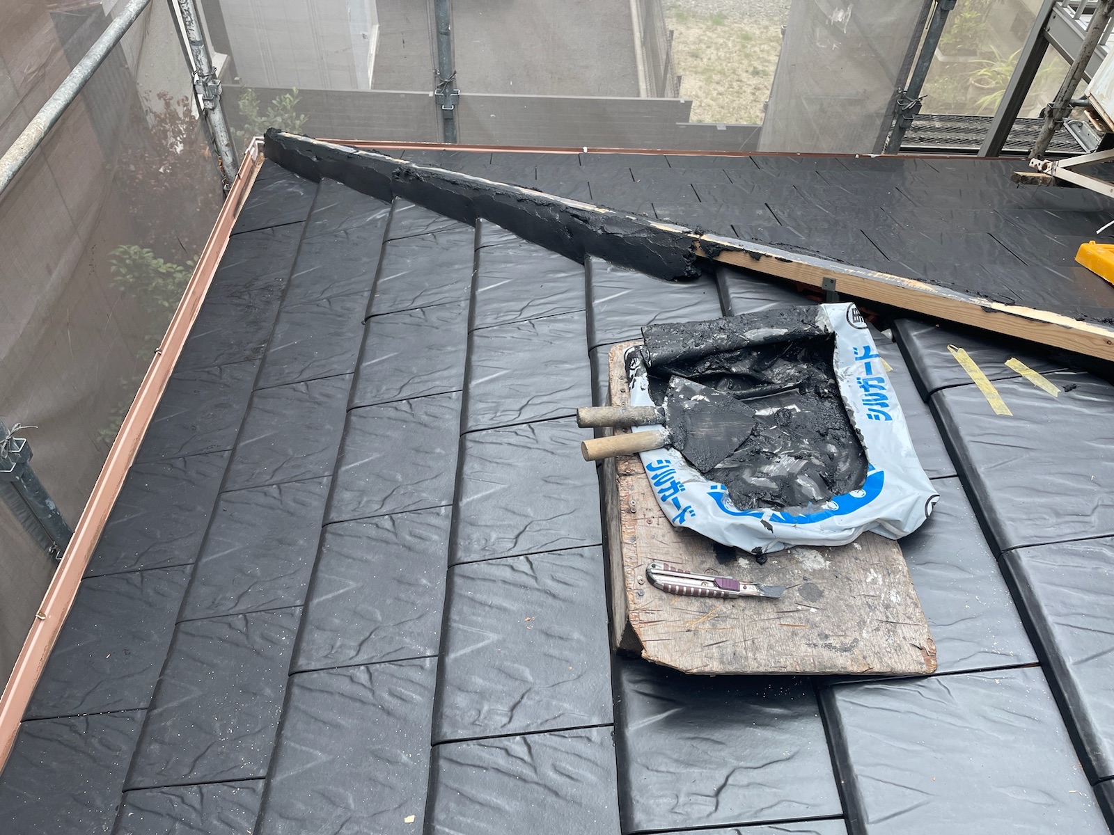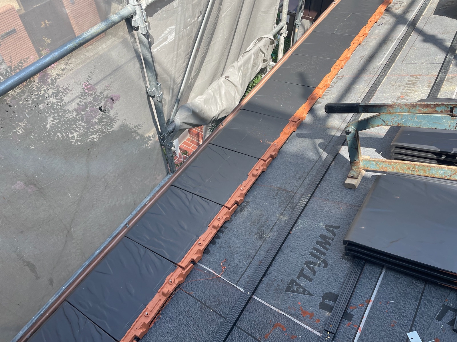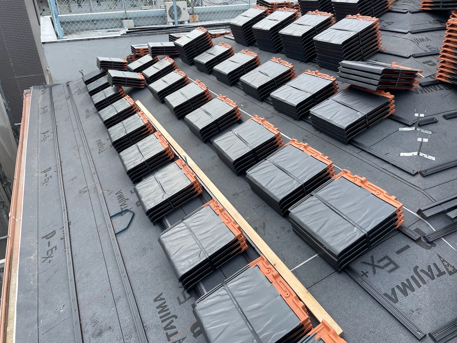 瓦の段に合わせて施工していきます。コチラに沿って瓦を止めていくことで、ズレなどが生じない施工ができます。