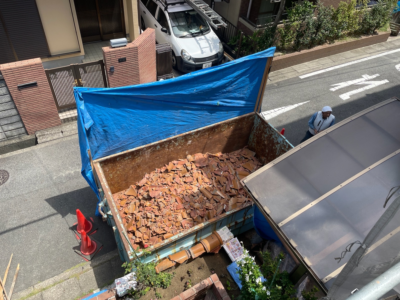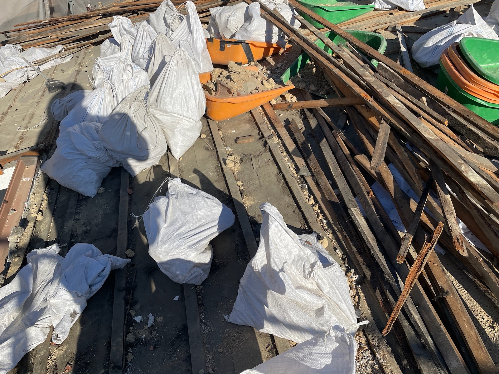 屋根を解体すると同時に、棟瓦や屋根瓦を支えていた葺き土・木材も一緒に撤去を行います。