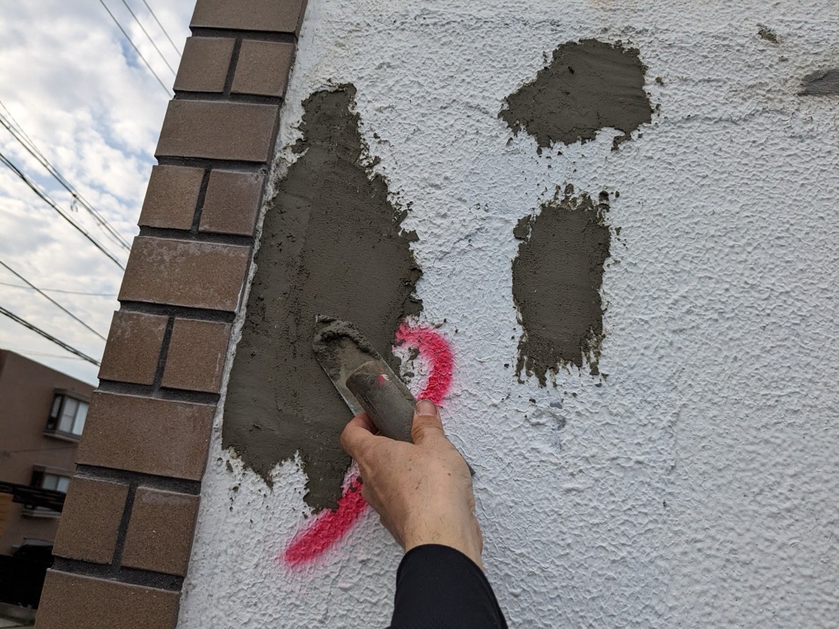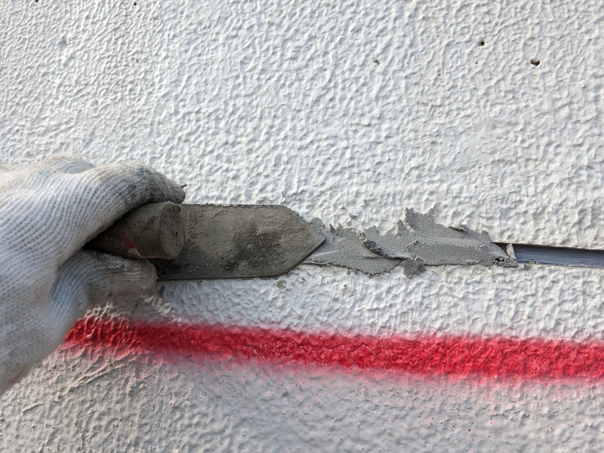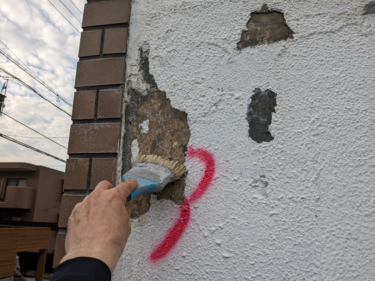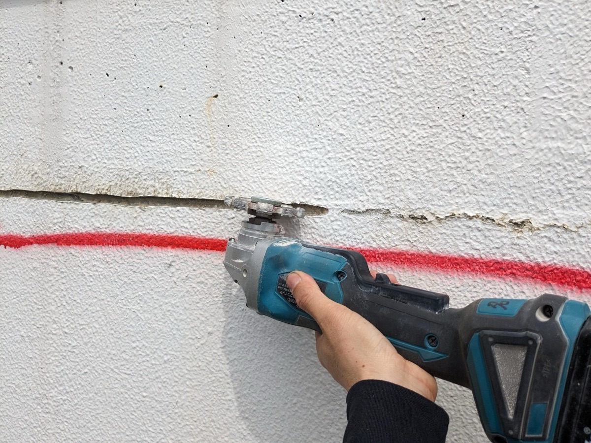 ヒビや剥離部分は、しっかりと補修材がとどまるように、崩したり、わざと切れ目を開き