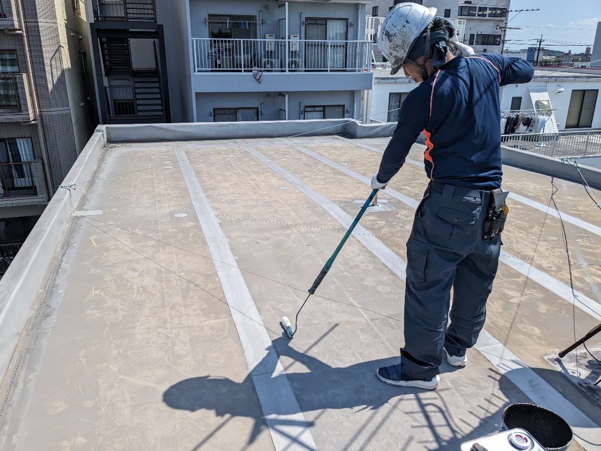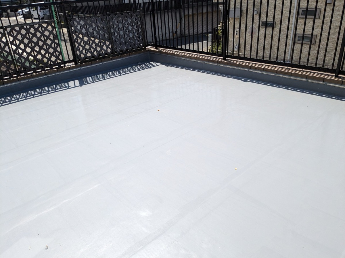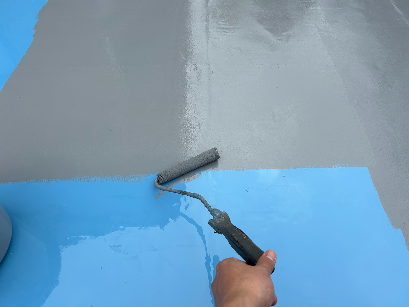そこまでの処理をしっかり行ってからウレタン防水塗膜を施工し、その上からトップコートを施工し、防水工事は完了となります。