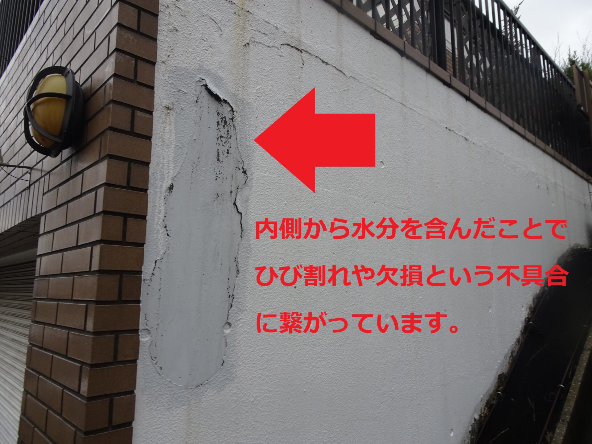 その結果、擁壁にはひび割れや膨れ、爆裂などの症状が起きています。