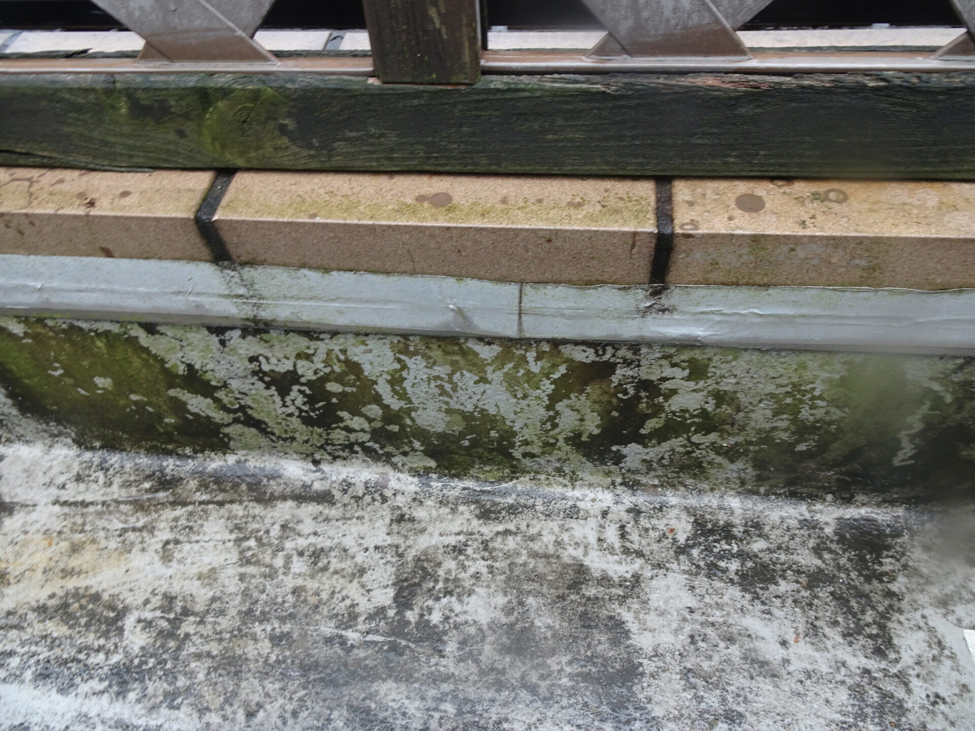 さらにテラスの立ち上がりには、苔が付着していました。水はけが悪いか湿気が溜まりやすい場所である事を指していますので、防水効果が失われてきているかと存じます。