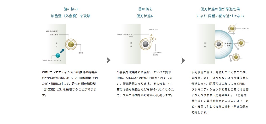 PBMは菌等を死滅させるわけではなく忌避効果という菌等を寄せ付けない仕組みになっています。