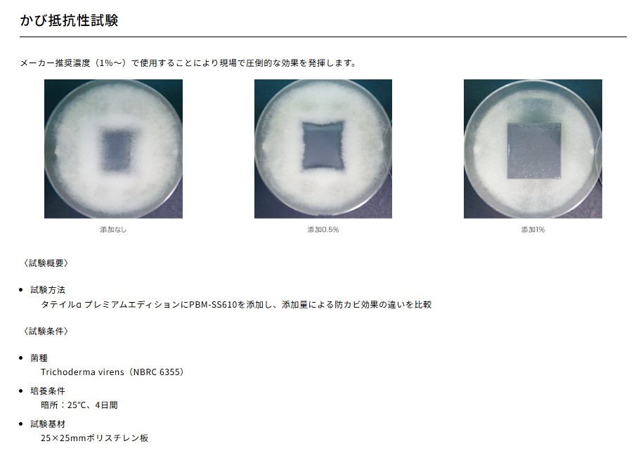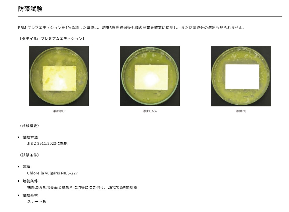 カビの試験と同様1%添加された一番右側の試験結果は藻の繁殖が抑えられています。