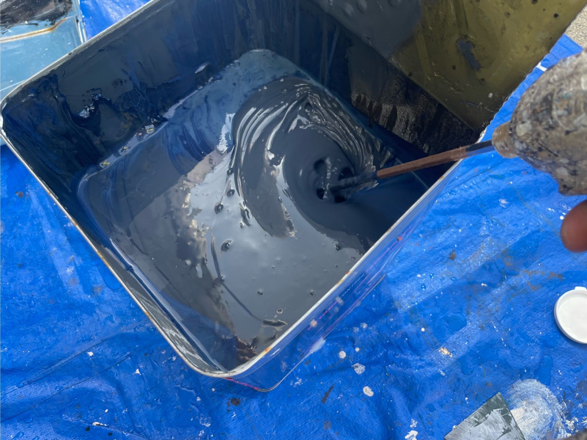 規定量計り、上塗り塗料に入れ、しっかりと攪拌し塗装していきます。