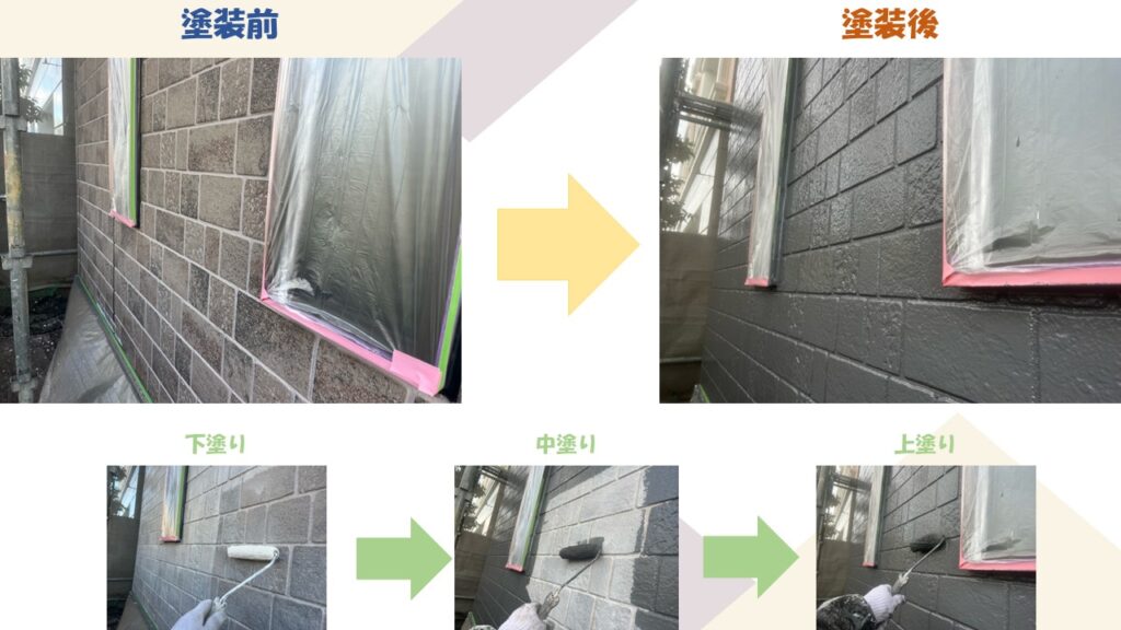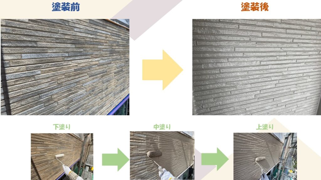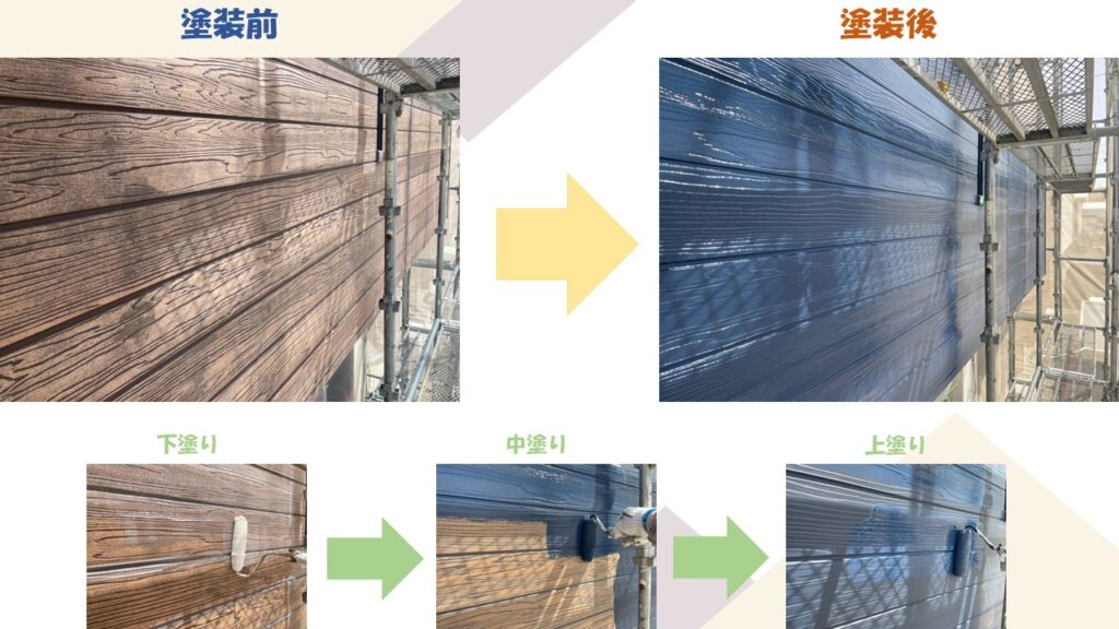 下塗り→中塗り→上塗り→トップコートの順で施工していきます。