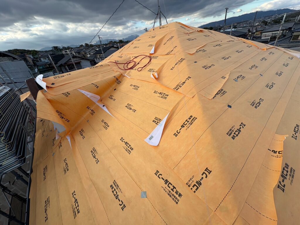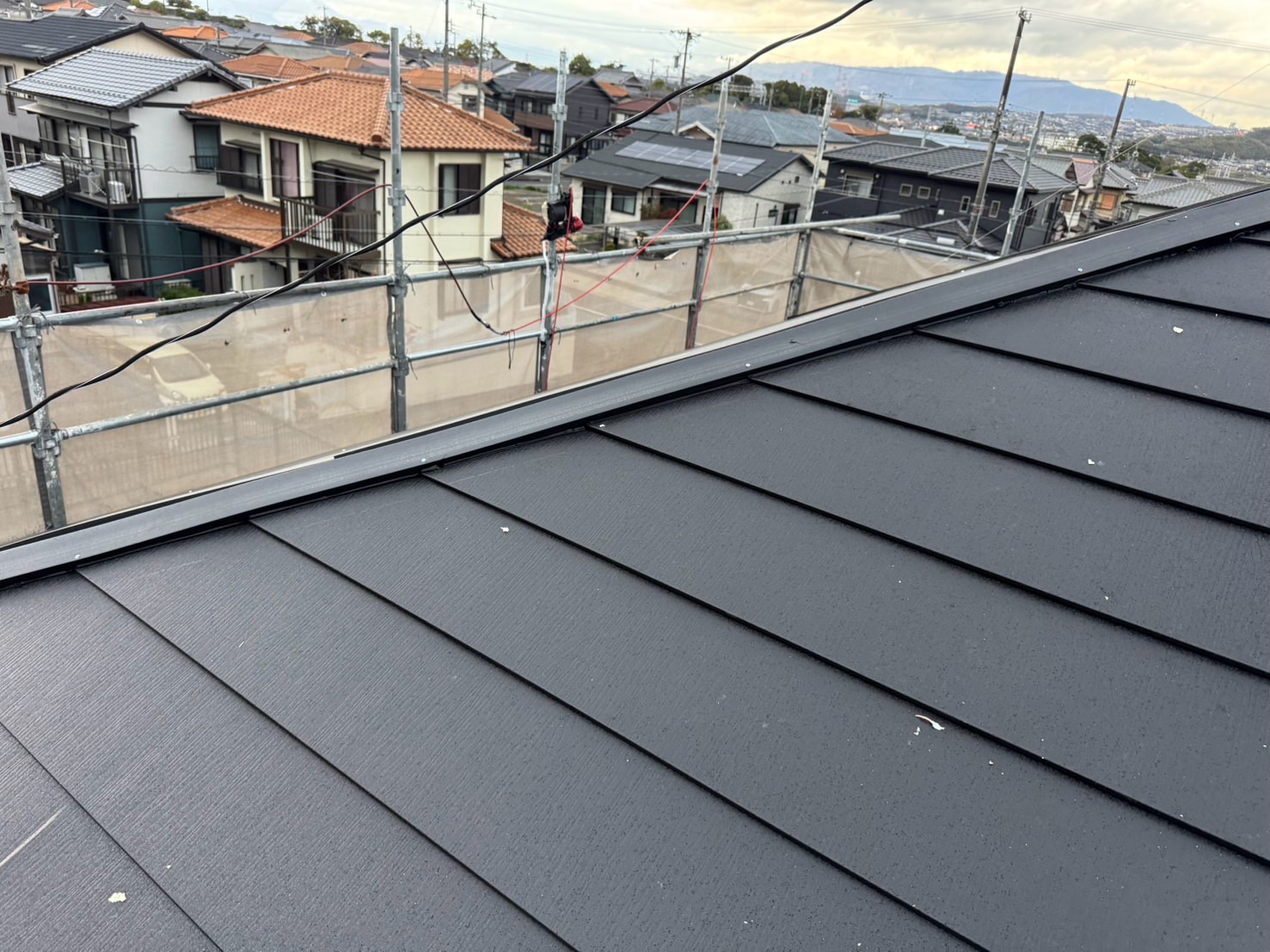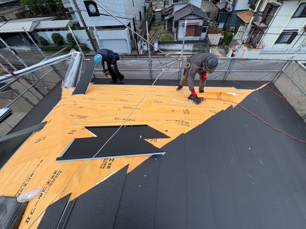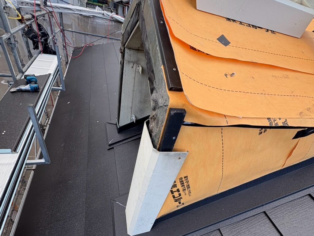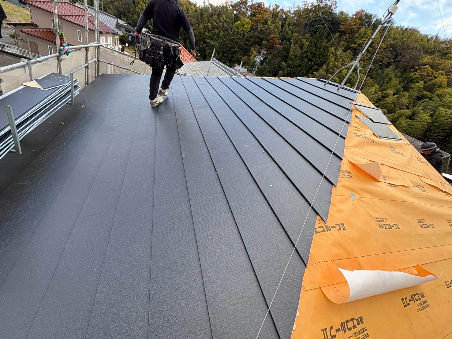 防水シート施工後、新しい屋根材、それに準ずる板金材(棟板金・ケラバ等)を施工し屋根は完了です。