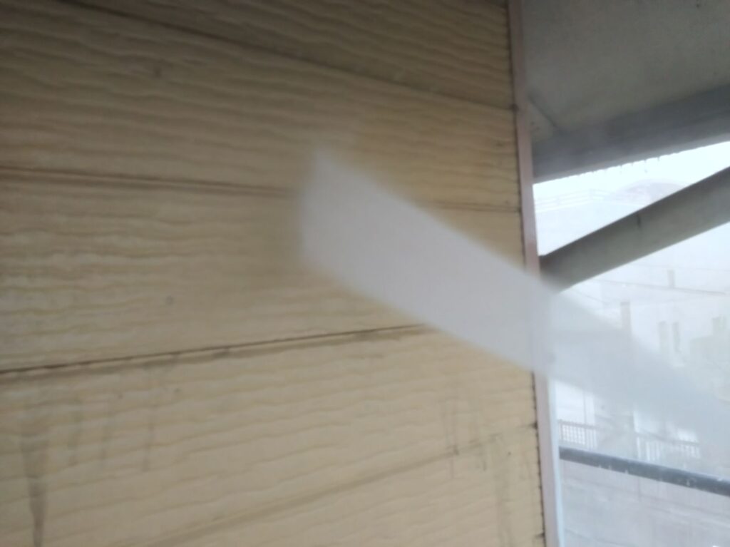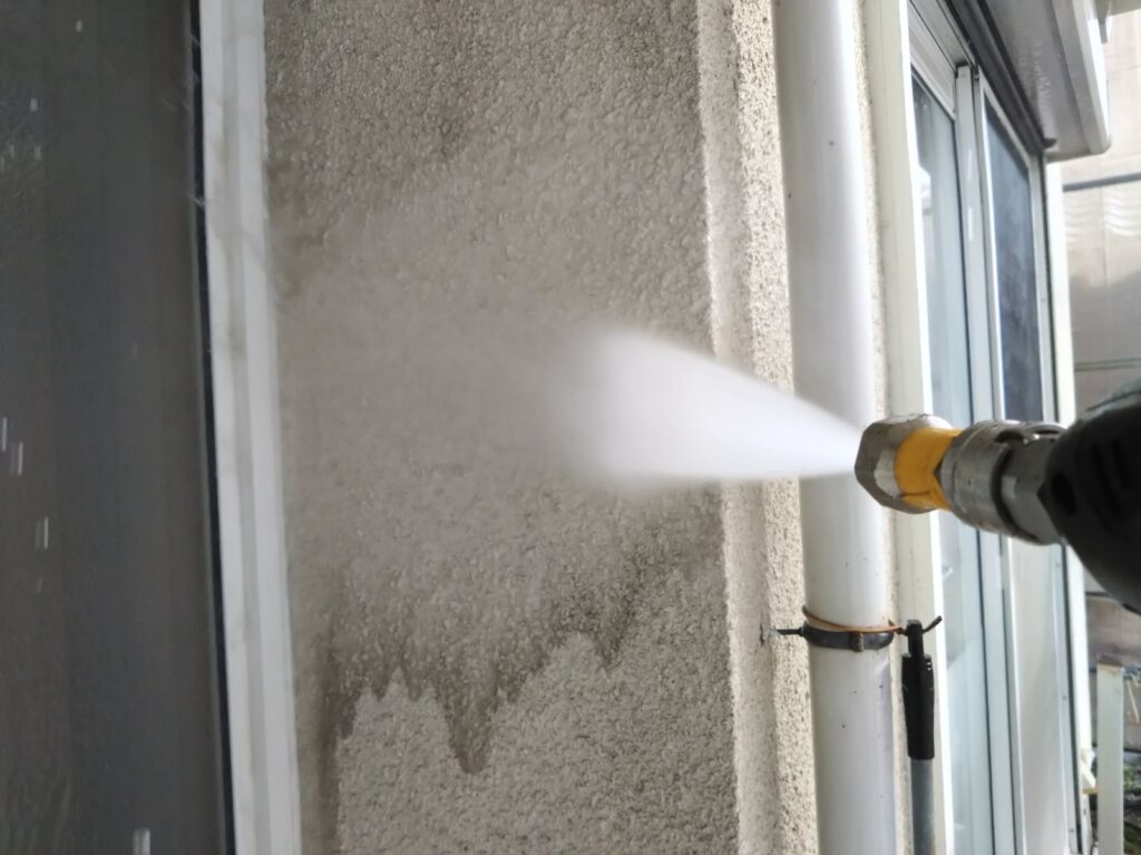 足場を組んだら、まずは高圧洗浄で、溜まった汚れや埃、チョーキングを落としていきます。