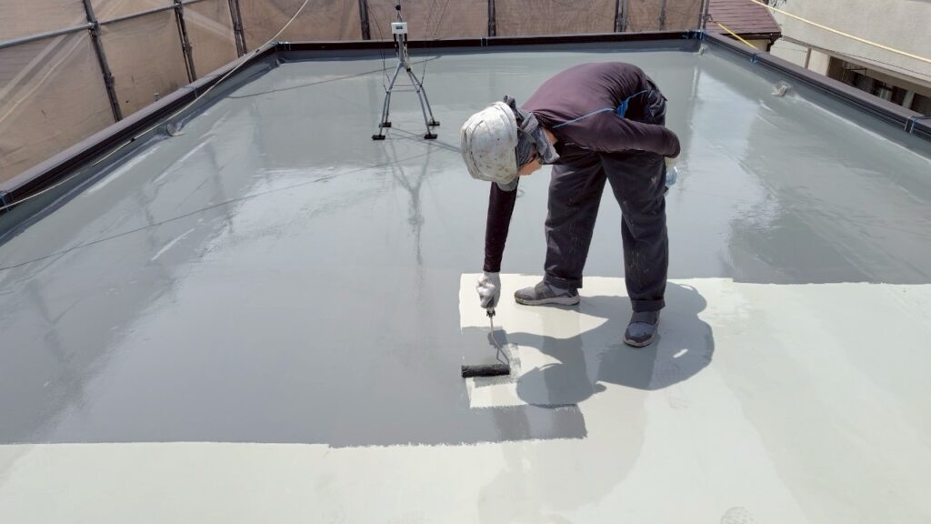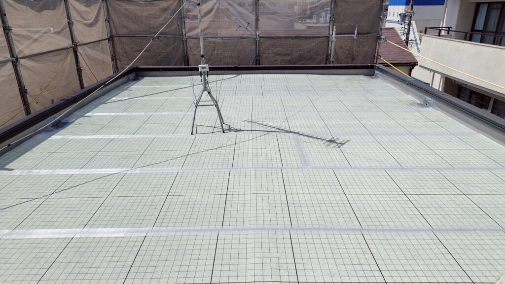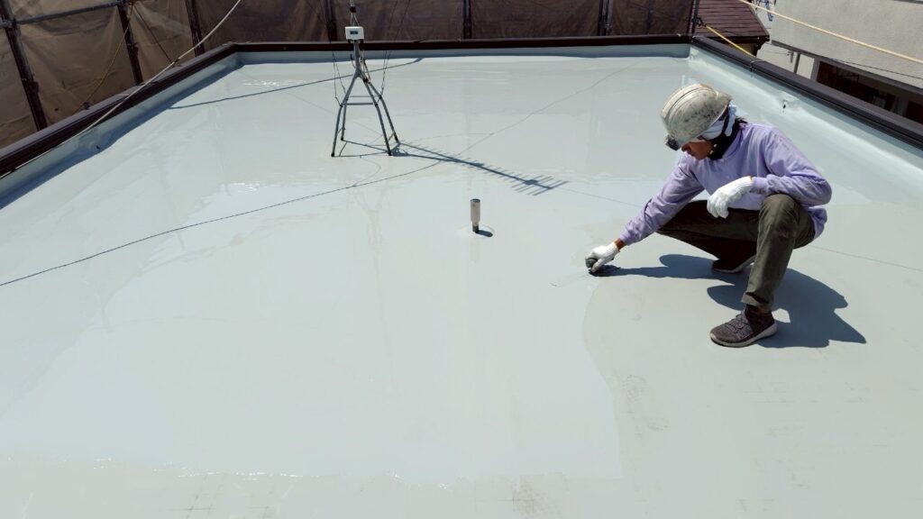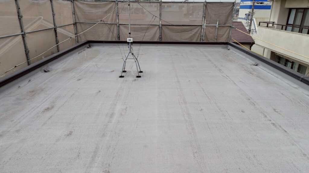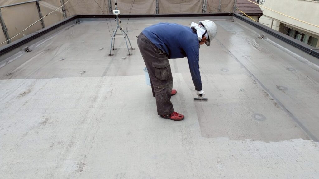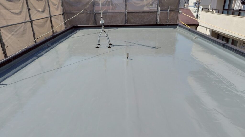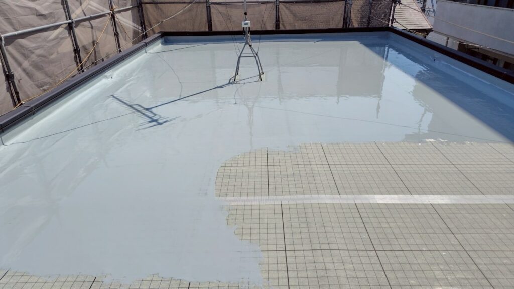 既存の防水層にウレタン塗膜防水工事を施工する事で、新しく防水層を形成する工事を行いました。