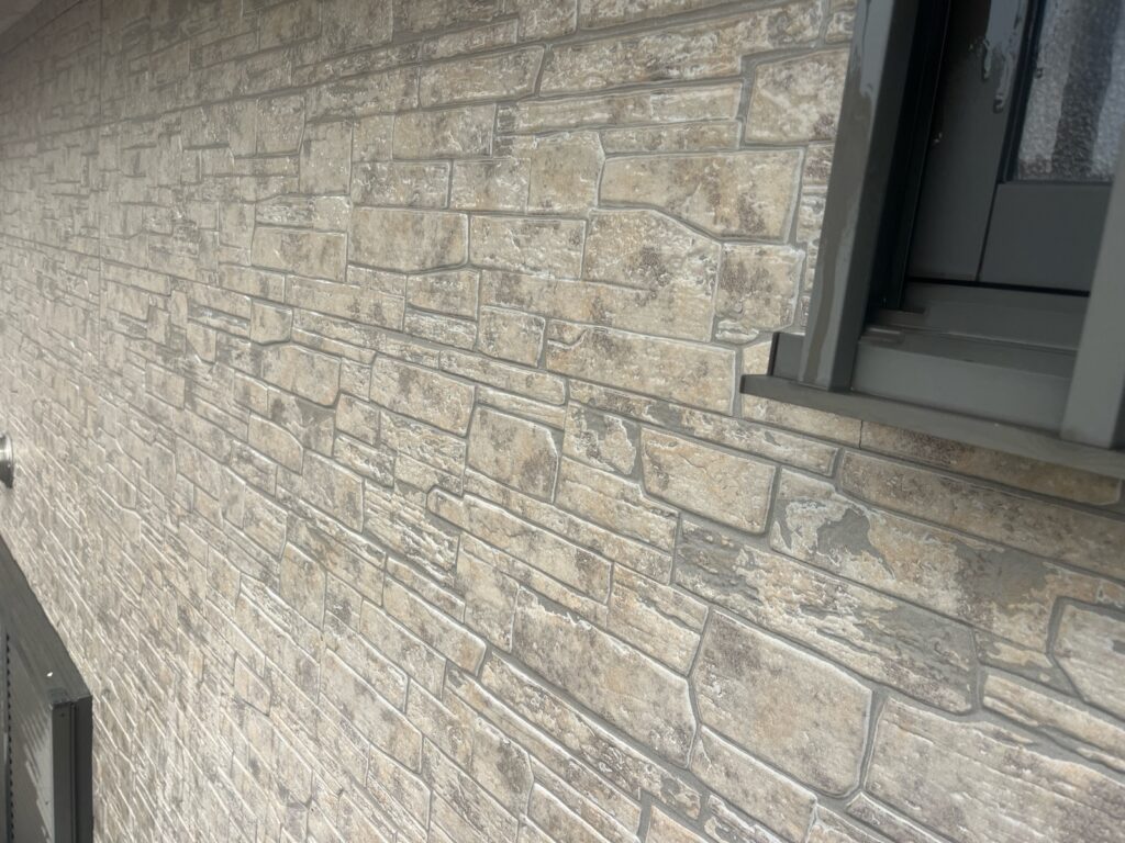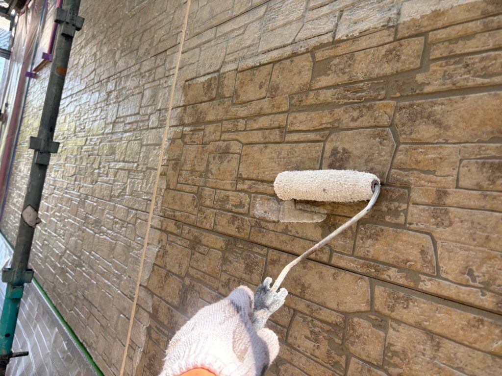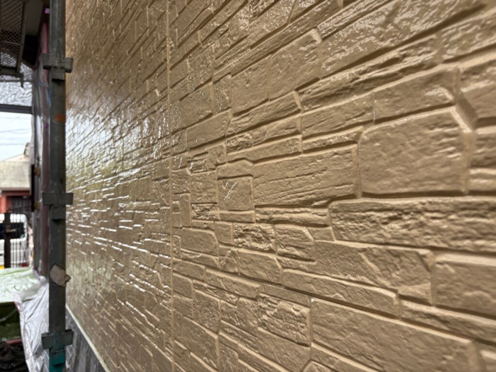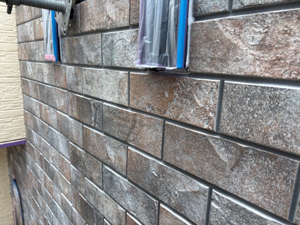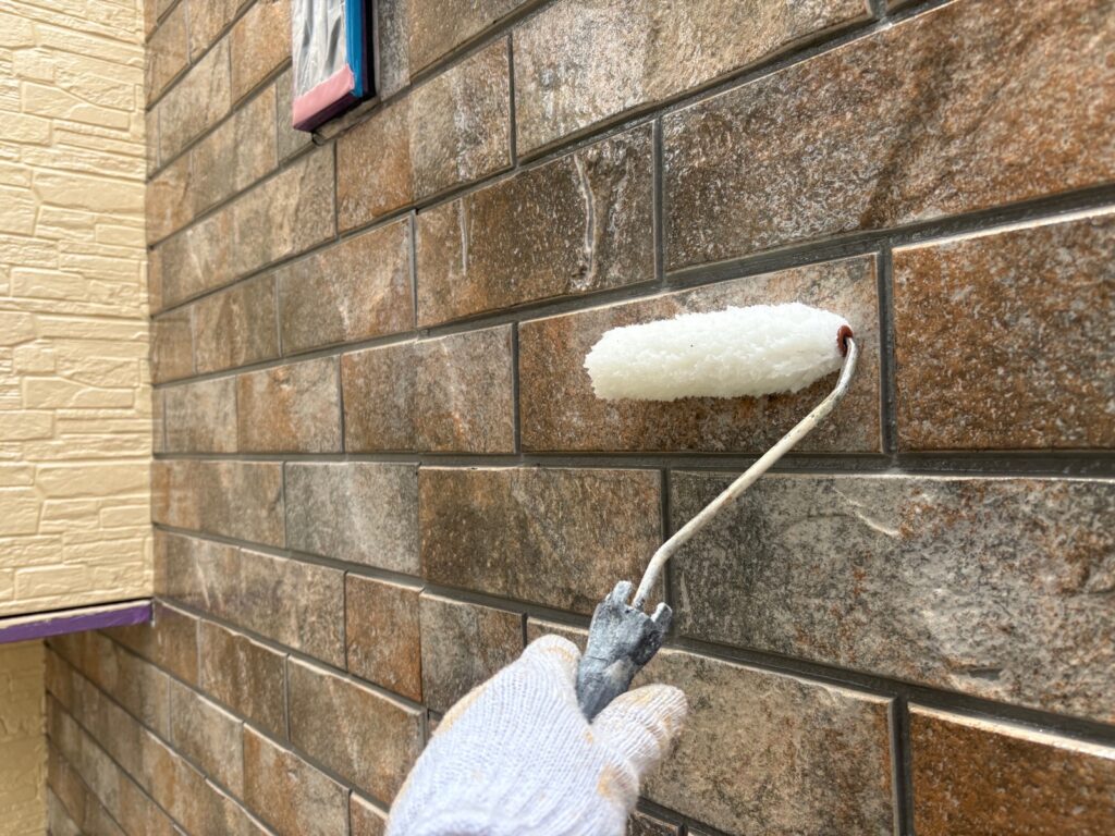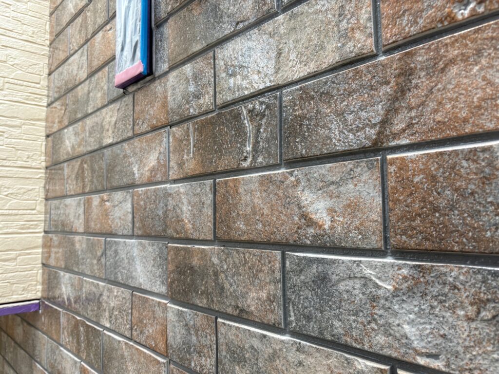 外壁の独特なタイル調サイディング部分は透明な塗膜でコーティングするクリヤー塗装で仕上げ、現在の意匠性を生かした塗装工事を行いました。