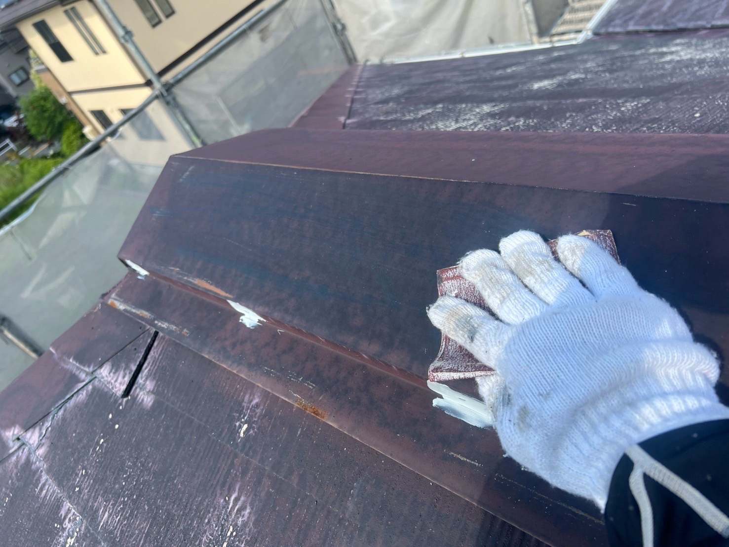 まずはケレンをし、錆落としをすると同時に、鉄部の様に、表面に凹凸がない為に塗膜がとどまりづらい箇所には細かい傷をつけて塗膜が留まるようにします。