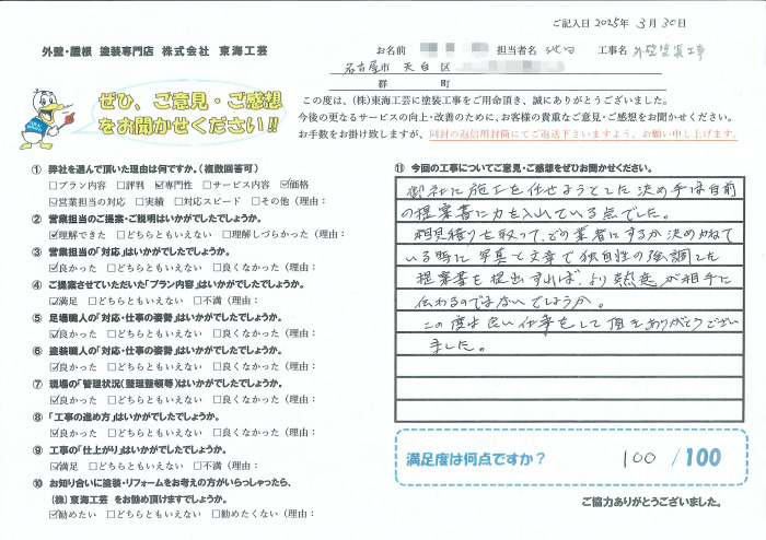 提案書でのご支援が施工業者選びの決め手となったとのお言葉をいただき、大変光栄に存じます。これからもお客様のご期待にお応えできるよう、さらなる努力を重ねてまいります。何かお困りのことやご相談がございましたら、いつでもお気軽にお声がけください。この度は、東海工芸に塗装工事をお任せいただき誠にありがとうございました。