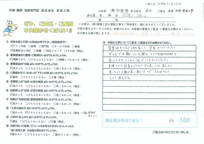 営業担当の方がとても良くて、塗装だけではなく、ダメ元でお願いした玄関のそうじや窓ふきもやってくれて、家がとてもキレイになった。見積りから提案までのスピードも早く、とても良かった。思ったより工期が長く感じたので、それ以外はとても満足です。