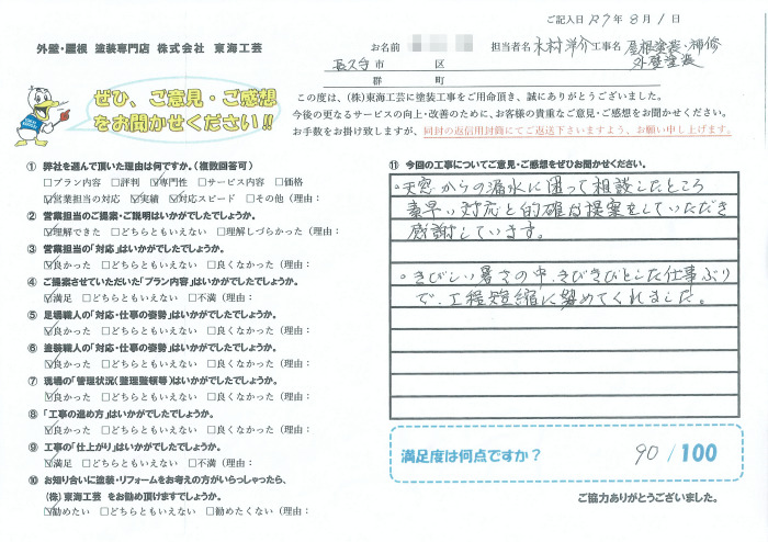 ・天窓からの漏水に困って相談したところ素早い対応と的確な提案をしていただき感謝しています。