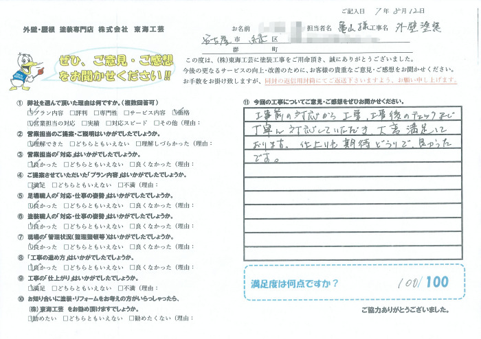 工事前の対応から工事中、そして工事後のチェックまでご満足いただけたとのお言葉を頂き、心より嬉しく思っております。仕上がりについてもご期待に沿うことができたとのことで、高い評価をいただきましたことに感謝申し上げます。今後とも何かお力になれることがございましたらお気軽にお声がけください。