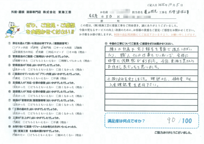 この度はお忙しい中、アンケートにご協力いただき、誠にありがとうございます。また、弊社の施工や職人の仕事に対して温かいお言葉を頂戴し、心より感謝申し上げます。お客様に安心してお任せいただけるよう、これからも丁寧で信頼いただける対応を心がけてまいります。何かお困りのことやご相談がございましたら、どうぞお気軽にお声がけください。