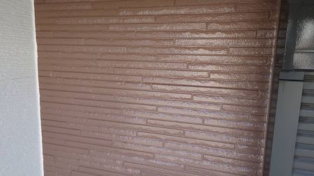 意匠性サイディング壁は、塗料の色を変えて塗り分けます。凹凸があるため塗り残しがないよう下塗りしていきます。