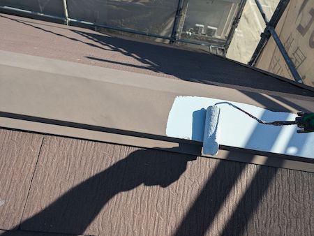 屋根板金の下地処理(ケレン)したら塗装に入ります。錆が発生することを予防して、密着度を向上させる錆止め塗料です。