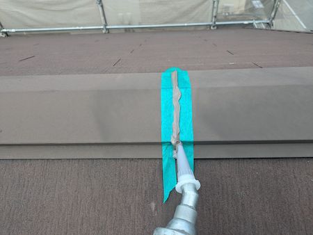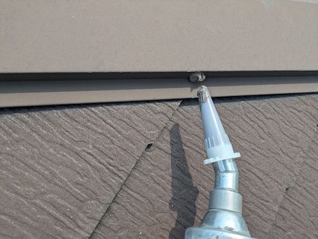 屋根板金のジョイント部分にはシーリング材を充填します。つなぎ目をしっかりと埋めて雨水の侵入を防ぎます。