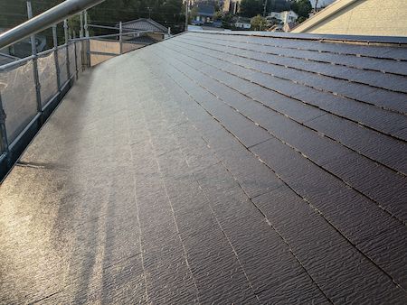 上塗り完了です。色あせていた屋根の色・つやがよみがえり、見違えましたね。お色はコーヒーブラウンです。