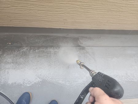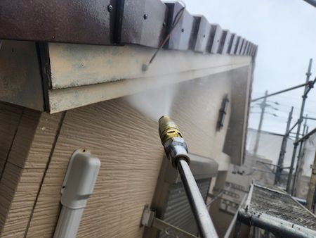 業務用の高圧洗浄機から水を噴射させ、その圧力によって破風板に付着している砂ぼこりや古い塗膜などの汚れを除去します。