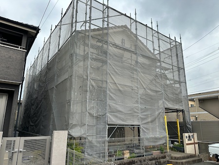 近隣挨拶を行って工事着工となります。足場を組み、洗浄水や塗料が飛散しないようにメッシュシートで建物全体を覆います。