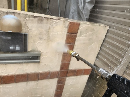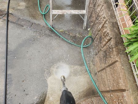 土間などの塗装しない箇所も含め、外回りも洗浄します。高圧洗浄した部分がキレイになっていることがわかりますね。