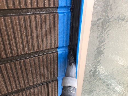プライマー乾燥後、シーリングを充填していきます。サッシまわりは既存のシーリングの上に増し打ちする工法で施工します。
