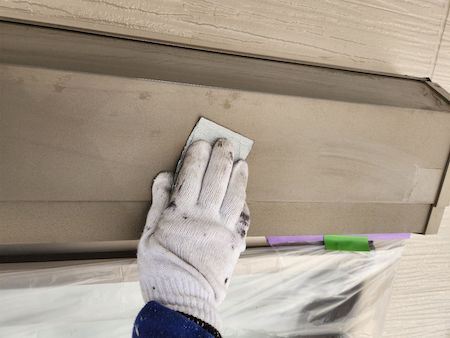 古い塗膜を削り落とし、塗料が密着しやすくなるように細かい傷をつける作業です。