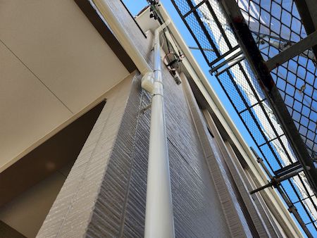 縦に設置された樋は、外壁の色調となじむ白系に仕上げています。