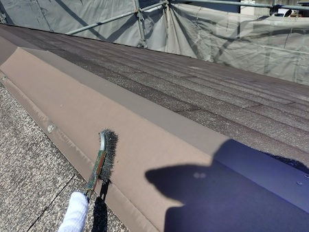 屋根板金のケレンです。錆や古い塗膜を削り落とし、塗料が密着しやすくなるよう様々な道具を用いて塗装面を整えます。