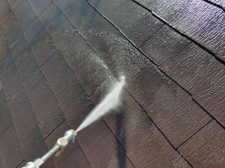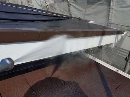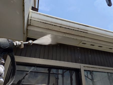 業務用の高圧洗浄機から水を噴射させ、その圧力によって破風板に付着している砂ぼこりや古い塗膜などの汚れを除去します。