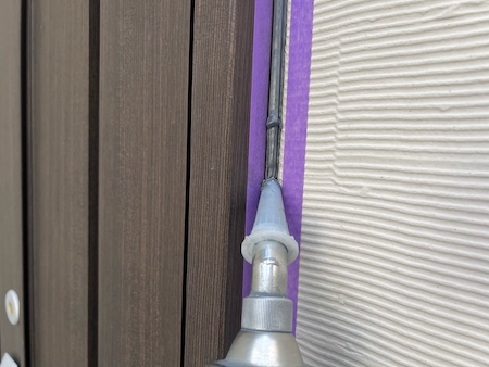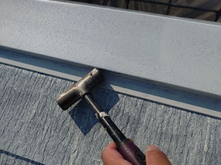 釘の浮きを打ち直します。その後、釘頭にシーリングを充填してフタすることで、抜けの防止や微細な雨水の侵入を防ぎます。