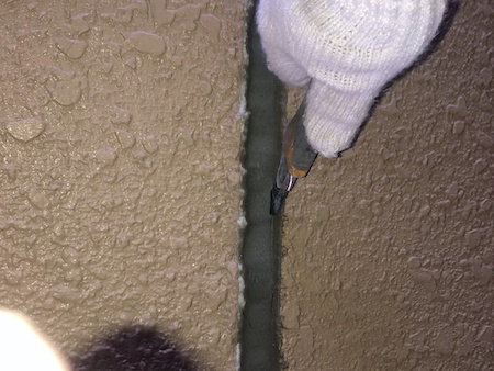 目地シーリングを撤去して、新しいシーリングに打ち替えていきます。カッターナイフでシーリングに切れ目を入れています。
