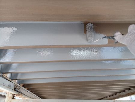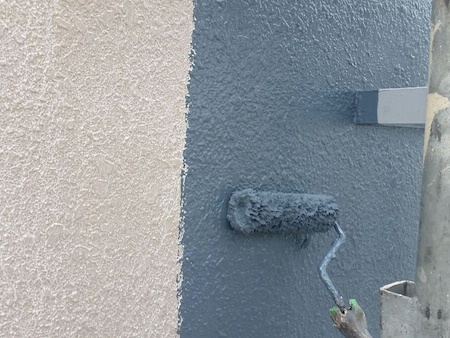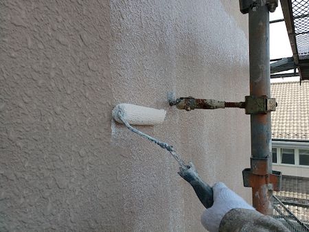 外壁の素材、下地の状態に合わせて選定した塗料で下塗りです。下地の状態によって最適な塗料と丁寧な技術で施工します。