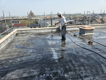 屋上の洗浄です。高い水圧の水を噴射させ、その圧力によって長年の蓄積された汚れがどんどん洗い流されていきます。