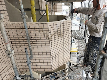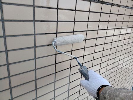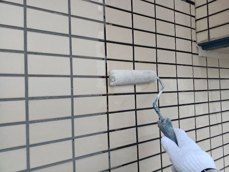 タイル壁には、日本ペイントのグラシィガードを塗布します。タイル自体の耐久性は高いのですが、モルタル目地からの水の浸入を抑制します。