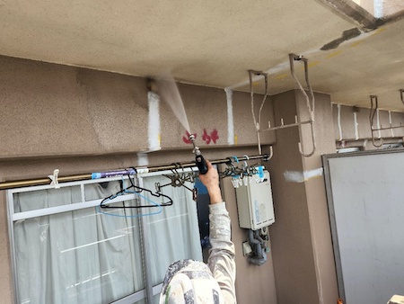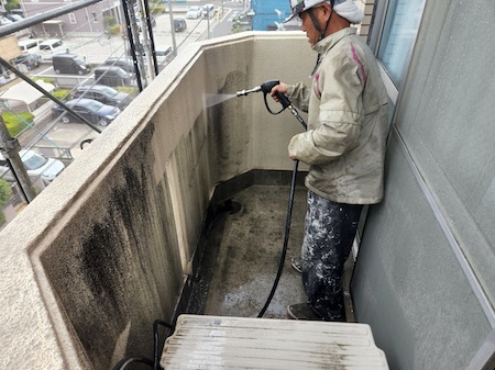 ベランダは、砂埃なども溜まりやすく汚れていることが多い場所です。内壁、仕切り板、床面など念入りに高圧洗浄します。