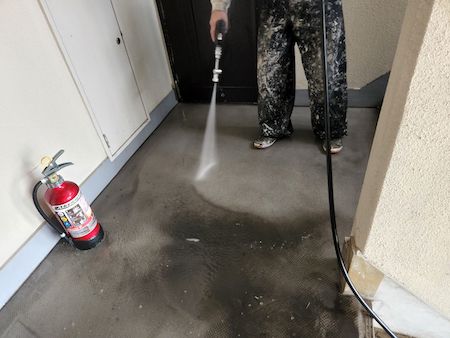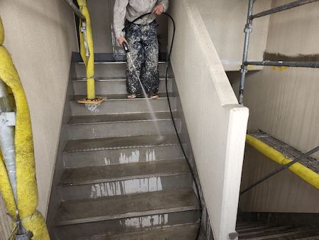階段の踊り場を洗浄しています。洗っている部分が、きれいになっていることがわかりますね。