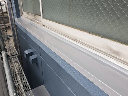 外壁に関しては、ひび割れや爆裂等の補修作業を行ってから、塗装を行っております。使用した塗料はプレマテックス株式会社のグラステージシリーズ・フレックスカラーです。無機塗料の特性である長期間の耐候性に加えて、弾性の柔らかい塗膜が地震などの揺れにも追従し、割れにくい塗膜を形成してくれます。
