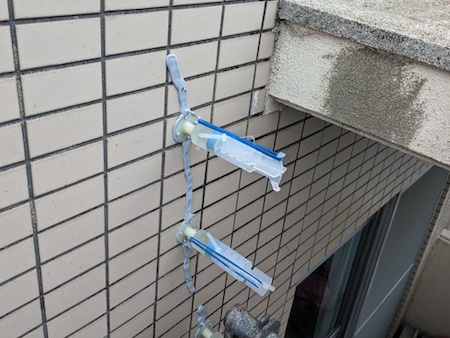 タイルのひび割れ箇所は、低圧注入工法で補修していきます。ひび割れの真上に座金を取付け、圧漏れを防ぐための剥離シーリング材を充填し注入準備をしています。